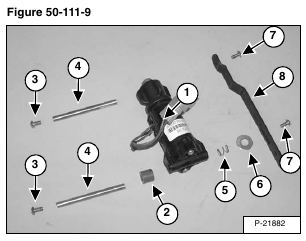 While removing the mounting pin (Item 2) from the handle sensor, remove the one plastic spacer (Item 3), the spring (Item 4) and washer (Item 5) [Figure 50-111-7].