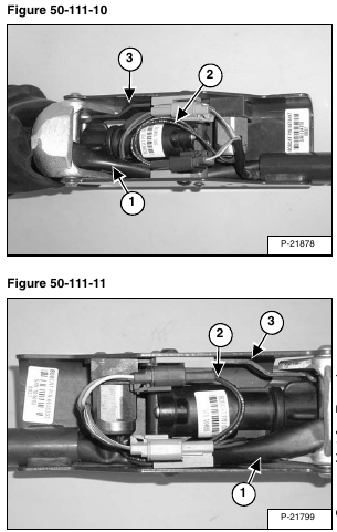 Installation: When installing the handle sensor into the control handle, check the routing of the switch handle wire harness (Item 1) [Figure 50-111-10] & [Figure 50-111-11] to assure proper return of the control handle to neutral and minimize harness movement.