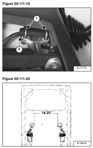 Installation: Tighten the u-bolts so the lever can not be moved either right or left when seated in the operator seat. Control lever end (Item 2) [Figure 50-111-19] should be flush with bellcrank. Be sure the control lever does not interfere with the operator cab when lowering or raising the cab. The distance between handles should be 18.25 inches [Figure 50-111-20].