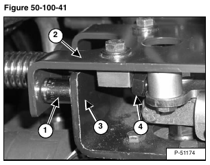 Move the right side steering lever forward and install a 15/16 in. (24 mm) thick spacer (Item 1) between the center plate (Item 2) and the mounting plate (Item 3) [Figure 50-100-41].
