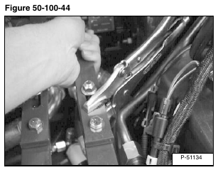 Move the left control lever to the full forward position, then pull forward on the left rear linkage bar until the pintle arm is rotated to the front as far as possible [Figure 50-100-44]. Use a locking plier, clamp the two linkage bars together.