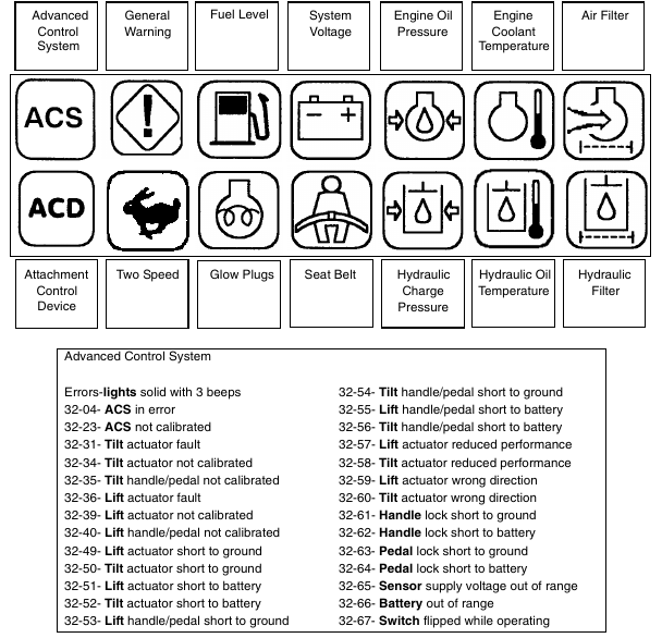 The Advanced Control System (ACS) has a built-in diagnostic function which uses an icon on the right instrument panel to indicate the condition of the ACS SYSTEM. The system also records the alarm condition as a service code.