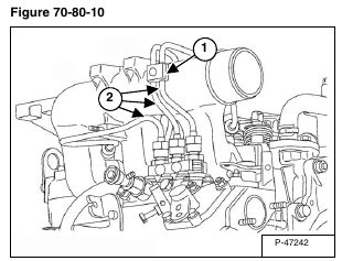 Loosen the bolts on the clamps (Item 1) and remove the injection tubes (Item 2) [Figure 70-80-10].