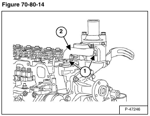 Remove the clamps (Item 1) and remove the hose (Item 2) [Figure 70-80-14] from the thermostat housing.