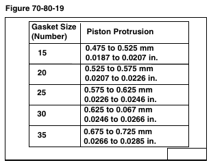 If the highest measurement exceeds the piston protrusion of the selected gasket, use the gasket which is one size larger. If the measurement exceeds gasket size 35, the engine must be disassembled, clearances checked, and reassembled.