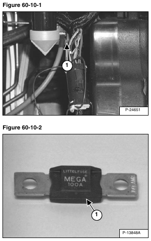 The loader has a 12 volt, negative ground alternator charging system. The electrical system is protected by a 100 amp master fuse (Item 1) [Figure 60-10-1] & [Figure 60-10-2] to protect against serious system overloads that could lead to burned up harness or loader damage. This fuse is located in the left-hand side engine compartment, just forward of the engine harness connector.