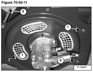 Remove the four mounting bolts (Item 1 and Item 2) and spacer tubes. The only visible spacer tubes are on the outside of the blower housing using mounting bolts (Item 2) [Figure 70-50-11].