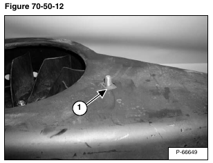 NOTE: The picture shows the blower housing and fan assembly removed from the loader. Two of the mounting bolts (Item 1) [Figure 70-50-11] have clips (Item 1) [Figure 70-50-12] to hold the bolts from falling out during factory installation of the blower housing and fan together. The clips will fall during the removal of the fan motor assembly bolts.