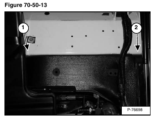 After the blower housing is installed, apply a bead of polyurethane caulk sealant (P/N 6633583) between the front edge (Item 1) of the crossmember and blower housing (Item 2) [Figure 70-50-13] directly in front of the inlet opening only.