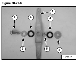 The parts that go into the pivot arm (Item 1) are the bolt (Item 2), washers (Items 3), fiber washers (Items 4), and spacer (Item 5) [Figure 70-21-6].