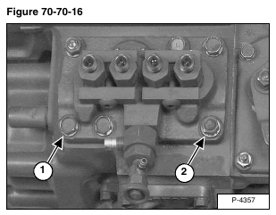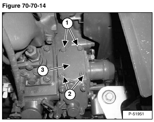 Remove the four mounting bolts (Item 1) and two nuts (Item 2) [Figure 70-70-16] from the injection pump.