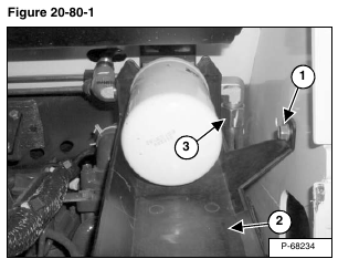 Remove the mounting bolt (Item 1) and remove the hydraulic filter drip pan (Item 2) [Figure 20-80-1].