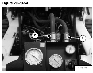 Connect the INLET hose (Item 1) [Figure 20-70-54] from the tester to the OUTLET hose (Item 1) [Figure 20-70-53] of the pump. Connect the OUTLET hose (Item 2) [Figure 20-70-54] from the tester to the tubeline (Item 2) [Figure 20-70-53] on the control valve.
