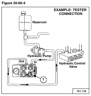 Connect the INLET hose (Item 1) [Figure 20-60-3] from the tester to the OUTLET hose (Item 1) [Figure 20-60-2] of the pump. Connect the OUTLET hose (Item 2) [Figure 20-60-3] from the tester to the tubeline (Item 2) [Figure 20-60-2] on the control valve.