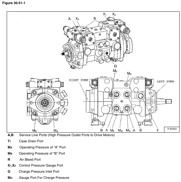 Ports are labeled on the hydrostatic pump casting.