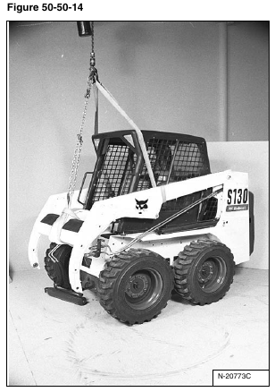 Raise the lift arms with the chain hoist so the lift arms are free from the loader [Figure 50-50-14].
