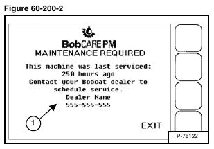 The Keyless Right Panel, if equipped, will display a message (Item 1) [Figure 60-200-2] alerting the operator to service the machine. This message will remain for 10 seconds before reverting back to the previous screen and will appear for 10 seconds every time the machine is started until the maintenance clock is reset.