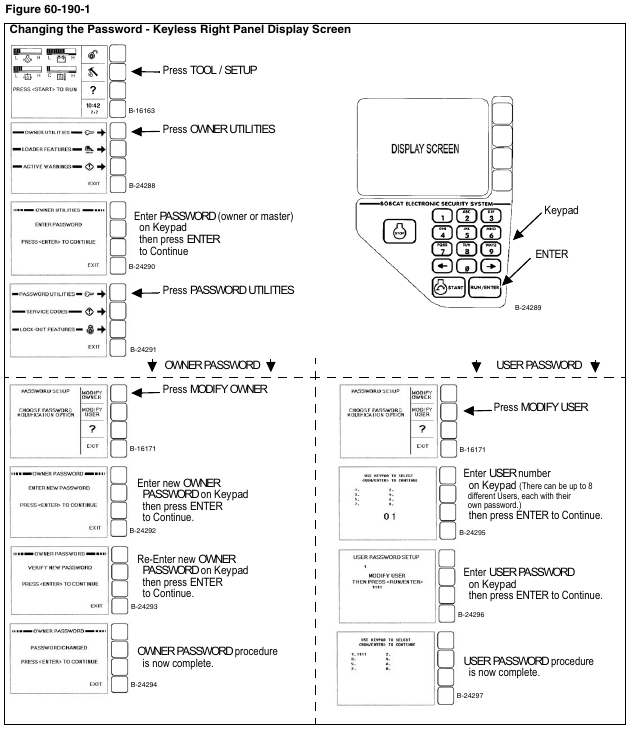 Posted on October 17, 2023 by Jack BOBCAT S130 – PASSWORD SETUP (IF EQUIPPED WITH KEYLESS START) – Changing The Owner And User Passwords