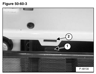 Installation: Line up the tab (Item 1) on the grill with the slot (Item 2) [Figure 50-60-3] on the loader mainframe. Insert the tab fully and then push down.