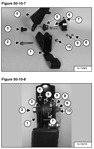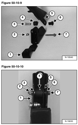 Assemble the parts as shown for the right side of the seat bar pivot assembly [Figure 50-10-9] & [Figure 50-10-10].
