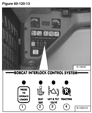 Fasten the seat belt, disengage the parking brake button, press the PRESS TO OPERATE LOADER Button (Item 1) [Figure 60-120-13] and raise the Seat Bar fully. Move the steering levers slowly forward and backward. The TRACTION lock (Item 4) [Figure 60-120-13] should be engaged. Lower the Seat Bar. Press the PRESS TO OPERATE LOADER Button (Item 1) [Figure 60-120-13].