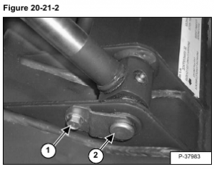 Remove the bolt (Item 1) and the retainer (Item 2) [Figure 20-21-2] from the Bob-Tach and tilt cylinder rod end pivot pin.