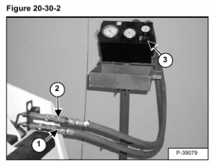 Connect OUT port of the hydraulic tester to the top (male) quick coupler (Item 2) [Figure 20-30-2] on the loader.