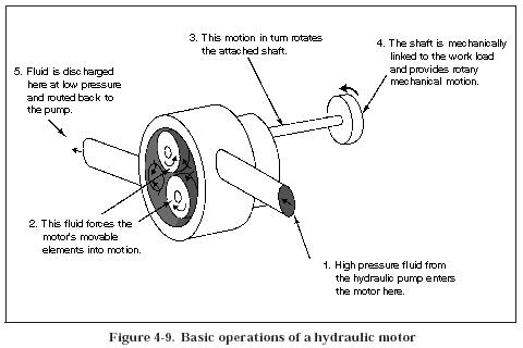 Hydraulic motors convert hydraulic energy into mechanical energy. In industrial hydraulic circuits, pumps and motors are normally combined with a proper valving and piping to form a hydraulic-powered transmission. A pump, which is mechanically linked to a prime mover, draws fluid from a reservoir and forces it to a motor. A motor, which is mechanically linked to the workload, is actuated by this flow so that motion or torque, or both, are conveyed to the work. Figure 4-9 shows the basic operations of a hydraulic motor.