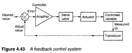 Servo valves are generally used as part of an external control loop in a feedback control system. The principle of a feedback control system is shown in Figure 4.43 where some plant variable (velocity or position, for example) is to be controlled. The plant variable is measured by a suitable transducer, and electronically compared with the desired value to give an error signal. This is amplified and used as the control signal for the servo valve.