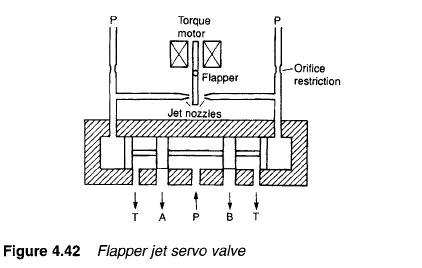 The servo valve in Figure 4.42 is called a flapper servo and is really the inverse of the jet pipe servo. Here, pilot pressure is applied to both ends of the main spool and linked by orifices to small jets playing to a flapper which can be moved by the electrical control signal. Pressure at each end of the main spool (and hence spool movement) is determined by the flow out of each jet which, in turn, is determined by flapper position and electrical control signal.