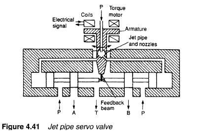 Figure 4.41 illustrates the construction of a different type of servo valve, called a jet pipe servo. Pilot pressure is applied to a jet pipe which, with a 50% control signal, directs an equal flow into two pilot lines. A change of control signal diverts the jet flow giving unequal flows and hence unequal pressures at ends of the main spool. The main spool is linked mechanically to the jet pipe, causing it to move to counteract the applied electrical signal. Spool movement ceases when the jet pipe is again centrally located over the two pilot pipes. This occurs when the main valve spool movement exactly balances the electrical control signal.
