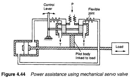 Figure 4.44 shows a purely mechanical servo used as a mechanical booster to allow a large load to be moved with minimal effort. The pilot valve body is connected to the load, and directs fluid to the fixed main cylinder. The cylinder, and hence the load, moves until pilot spool and cylinder are again aligned. Variations on the system in Figure 4.44 are used for power steering in motor cars.