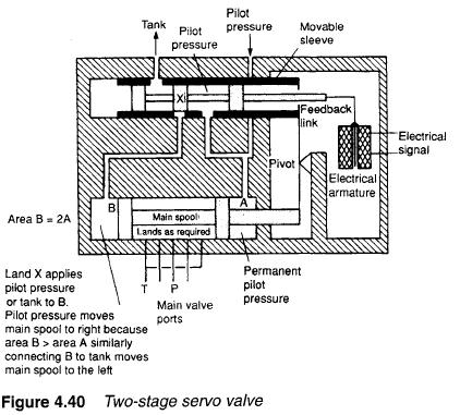 Servo valves are a close relative of the proportional valve and are based on an electrical torque motor which produces a small deflection proportional to the electrical current through its coil. They commonly use feedback between the main and pilot spools to give precise control. A typical device is shown on Figure 4.40. This consists of a small pilot spool connected directly to the torque motor. The pilot spool moves within a sliding sleeve, mechanically linked to the main spool.