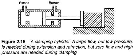 Many hydraulic applications are similar to Figure 2.16, where a workpiece is held in place by a hydraulic ram. There are essentially two distinct requirements for this operation. As the cylinder extends or retracts a large volume of fluid is required at a low pressure (sufficient just to overcome friction). As the workpiece is gripped, the requirement changes to a high pressure but minimal fluid volume.