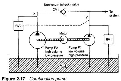 This arrangement saves energy as the large volume of fluid from pump P2 is returned to the tank at a very low pressure, and only a small volume of fluid from pump P1 is returned at a high pressure. Pump assemblies similar to that shown in Figure 2.17 are called combination pumps and are manufactured as complete units with motor, pumps, relief and check valves prefitted.