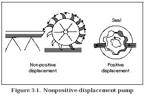If the outlet of a nonpositive-displacement pump is completely closed, the discharge pressure will rise to the maximum for a pump operating at a maximum speed. A pump will churn a liquid and produce heat. Figure 3-1 shows a nonpositive-displacement pump. A water wheel picks up the fluid and moves it.